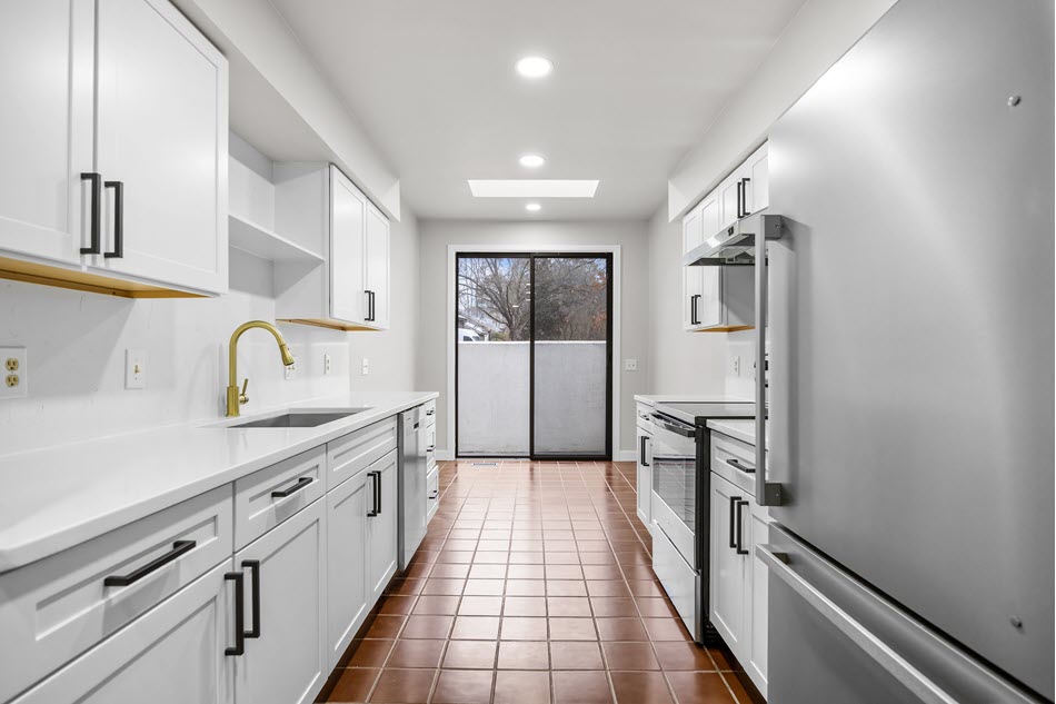 Step inside and the kitchen immediately catches your eye. Completely updated and thoughtfully designed, this galley-style kitchen hits the sweet spot between functional and refined. White soft-touch close cabinetry is paired with contrasting black metal hardware and white-and-gray veined quartz counters — a palette that feels current without trying too hard.