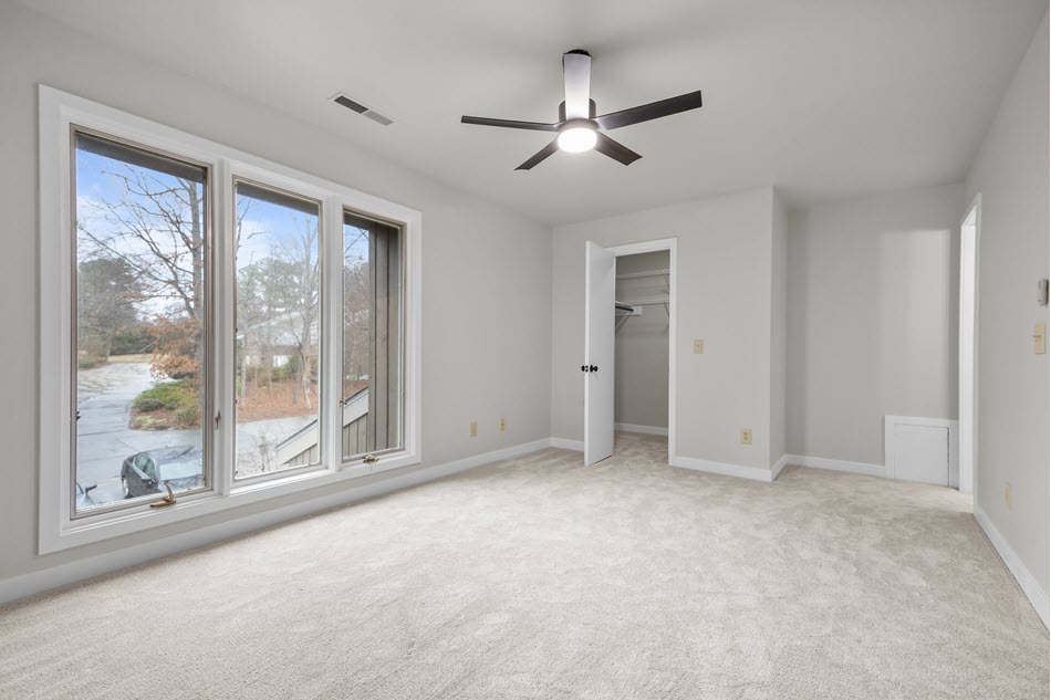 Two additional bedrooms continue the fresh, calm feeling — dual casement windows, new carpet, and remote-controlled ceiling fans in each. The second full bath keeps pace with everything else: cultured marble counters, coordinating ceramic tile, new cabinetry, and contrasting black hardware for a pulled-together look. A pull-down attic adds yet one more layer of flexible storage when you need it.