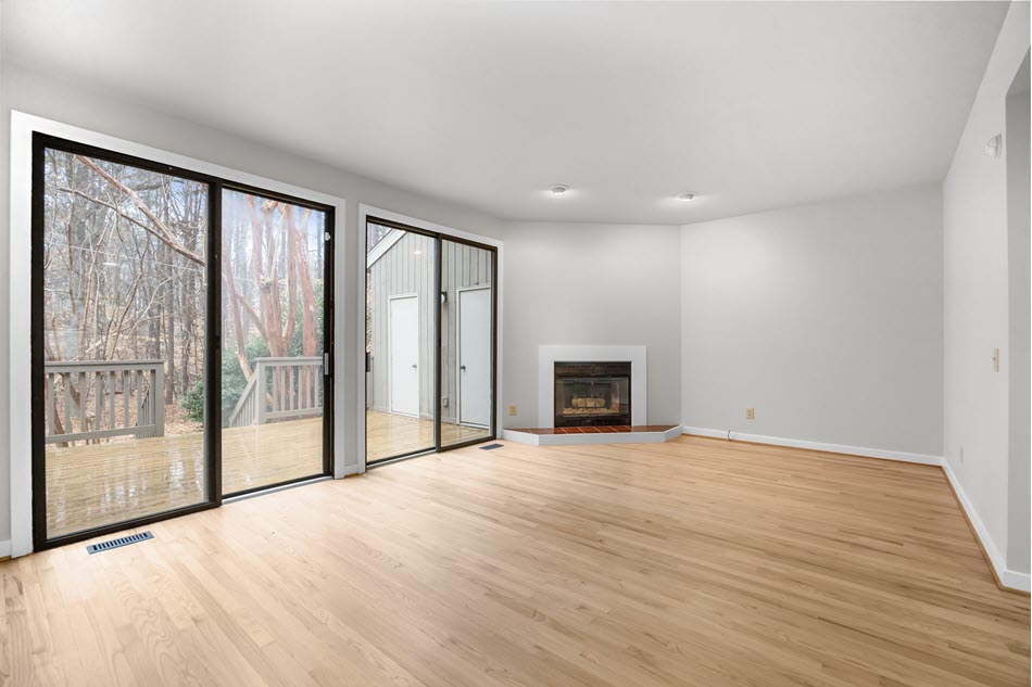 The main living spaces are connected and calm. Newly refinished hardwood floors run throughout, grounding the space in warmth, while a corner gas-log fireplace set on a raised hearth adds the kind of coziness that makes a home feel genuinely lived-in and loved. A perfect nook — ready for bookshelves, a reading corner, whatever you need it to be — adds a layer of character most homes simply don’t offer.