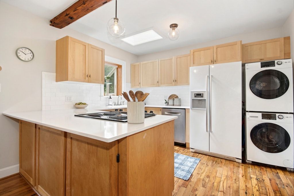 Here's what sets this place apart from every other "charming bungalow" on the market: the details that make daily life actually work. Hidden storage in the kitchen island means your counters stay clear. The built-in pantry handles overflow without cluttering your sight lines. That stackable washer and dryer? Tucked away but totally accessible. Even the attic storage is floored and accessed via pull-down stairs—because nobody wants to sacrifice style for practicality.