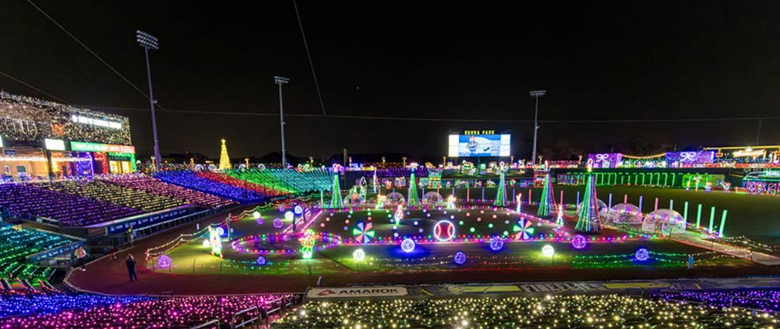 Over at the Durham Bulls Athletic Park, FestiBull of Lights turns the ballpark into a winter wonderland through January 1, 2026. Think thousands of synchronized lights, a visit with Santa, holiday crafts for the kiddos, and yes—s'mores. Because what's December without roasting marshmallows?