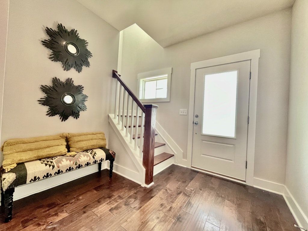 Nestled in the prestigious Briar Chapel community, this stunning green energy home perfectly marries contemporary amenities with enduring elegance. Picture yourself beginning each day with your morning coffee on the covered front porch, settling into the cozy swing as you watch your neighborhood come alive. From the tumbled brick stairs to the detailed bead-board ceiling, every element of this timeless entrance welcomes visitors with warmth and character. Step through the glass panel front door into a thoughtfully designed entry complete with a convenient nook and deep coat closet—the perfect introduction to a home that prioritizes both style and functionality.